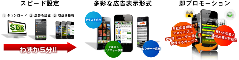 AdVisionはスマートフォン向けの広告配信プログラムであり、スマートフォン向けアプリケーション/Webサイトを展開する事業者様にマネタイズの一環としてご利用頂けるものとなっております。 |