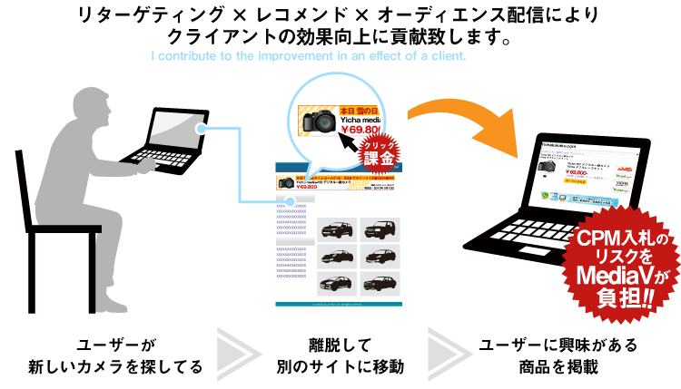 MediaVはDSP機能、レコメンド機能、DMP機能を自社開発にて提供しているため、広告配信の入札の際に第三者の機能提供者のマージンが発生いたしませんので、入札単価が抑えられます。